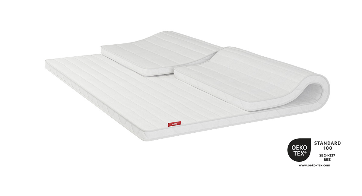 Tyget är tillverkat av ett rent monomaterial i 100 % polyester – helt utan tillsatta kemikalier – och har en teknologi som håller det noppfritt. Bäddmadrassen är kviltad med horisontella kanaler för optimal komfort, medan sidokanten har ett exklusivt rutmönster. För att ge en hälsosam sovmiljö och längre livslängd är textilöverdraget också tvättbart i 60°C och OEKO-TEX-certifierad.